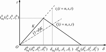 式中:为损伤后界面单元实际的法向和两个切向应力;d为界面刚度损伤因子;ti为按损伤前线弹性关系(见图6中K)计算的界面法向和切向应力。