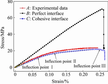 )计算值与实验值的比较如表4所示(计算弹性模量取应变0.06%)。可以看出除了拉伸应力计算值略低外,计算曲线C与实验曲线A的变化规律能够基本吻合(见图7),此外,弹塑性力学性能常数计算值相对实验值的误差小于7%(三项指标的误差分别为6.9%、4.8%和3.3%),说明基于基体延性损伤和内聚力界面损伤本构所建立的细观RVE有限元模型,能够较准确地计算和预测CF/Al复合材料横向弹塑性力学性能。由于CF/Al复合材料基体合金性能一般高于相应的铸态铝合金[22-23],而横向拉伸时基体合金是影响复合材料力学性能的重要因素,因此,采用铸态ZL301力学性能建立的复合材料细观RVE模型,其对横向拉伸应力的预测值较实验结果偏低。