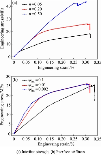 通过改变CF/Al复合材料RVE有限元模型中的界面强度因子η,计算获得了不同界面结合强度复合材料横向拉伸应力-应变曲线如图10(a)所示,其中η值越大意味着界面强度越高。可以看出界面强度对复合材料横向拉伸切线模量、屈服强度和极限强度均有显著影响。对于界面强度弱的复合材料(η=0.05),横向拉伸开始后应力-应变曲线很快就从线性阶段进入非线性阶段,原因在于弱界面复合材料在变形初期就发生了界面损伤脱粘;随着变形量增加界面破坏引起界面附近基体合金应力集中并诱发基体塑性变形损伤,直至界面和基体完全失效后导致复合材料发生横向断裂。当CF/Al复合材料界面强度增加后(η=0.2),其横向拉伸曲线的线弹性部分增加而非线性部分逐渐减小,同时复合材料横向拉伸极限强度也显著提高。界面强度高的复合材料(η=0.5)横向拉伸时表现出近似线弹性力学行为特征,随横向载荷增大直至变形中期界面才开始出现损伤,变形后期界面脱粘失效并引起界面附近基体合金损伤断裂,最终导致复合材料产生横向断裂。值得注意的是,在界面强度高的情况下,复合材料横向拉伸变形后期几乎同时发生界面和基体合金失效,从而使复合材料表现出较低的断裂应变。