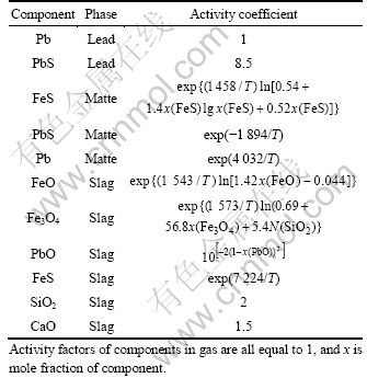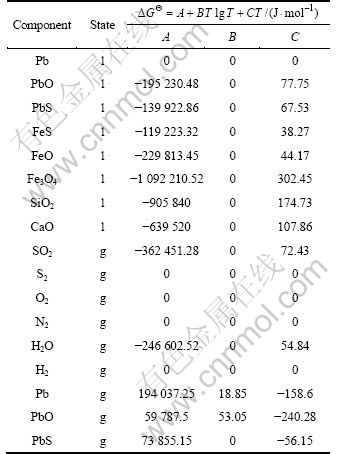铅闪速熔炼产物共有3相:粗铅相、炉渣相和烟气相。平衡时各相含有如下组分(由于本研究的主要目的是对硫化铅矿闪速熔炼过程进行热力学分析,精矿成分未考虑Zn、Cu和As等微量组分):