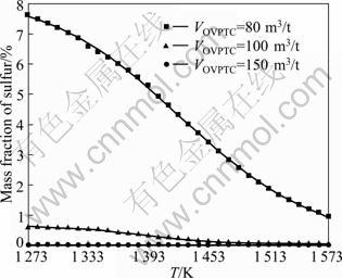 粗铅含硫量随T和VOVPTO的变化如图2所示。