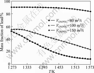 Fig.3 Effect of T and VOVPTO on lead content in slag