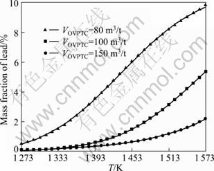 图4所示为烟气的含铅量(包括Pb、PbO和PbS)随T和VOVPTO的变化。图4表明,铅在烟气中的挥发损失总体上随T的升高而增加,随VOVPTO的增大而降低。