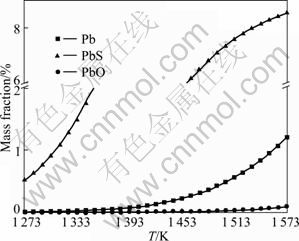 图5所示为VOVPTO为80 m3/t时烟气中各种形式铅的含量与T的关系。图5表明,烟气中PbS含量最高,其次是Pb,且都随T的升高而增大。由此可见,铅主要是以PbS的形式挥发进入烟气。