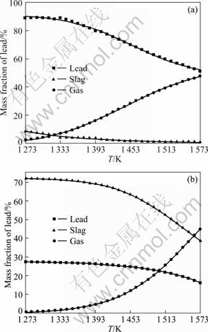 Fig.6 Effect of T on lead distribution ratio in different phases at different VOVPTO: (a) VOVPTO=80 m3/t; (b) VOVPTO=150 m3/t