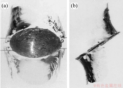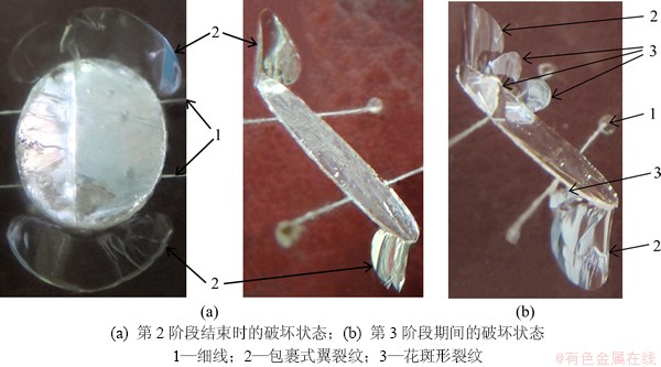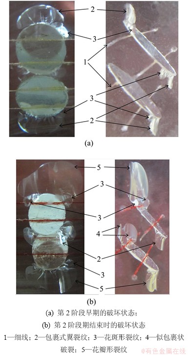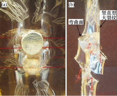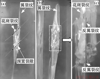 与文献[14]中的试验结果(图12)相比,本文中材料的透明性大幅提高,照片清晰度明显改善;试验中的始裂规律和某些破裂形态,如似包裹状破裂、花瓣形裂纹等,以及裂隙间的搭接贯通方式,也是此前未发现的。