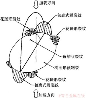 2) 花斑形裂纹通常仅绿豆般或更小,产生于次生裂纹的最外侧,其走向是从预制裂隙内部向外,并不是沿着预制裂隙边缘,且从萌生时刻起就与预制裂隙边缘存在一小的夹角。