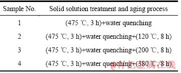 为了观察不同温度下材料组织结构的变化,取4块试样进行固溶和时效处理,工艺如表2所示。将所有试样进行抛光和金相腐蚀,腐蚀液为0.5%HF+ 1.5%HCl+2.5%HNO3+95.5%H2O(质量分数),最后利用Olympus光学金相显微镜观察原始试样和处理后试样的组织结构变化。
