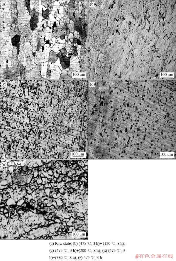 Fig. 3 Optical micrographs of 7050-T7451 Al alloy after different heat treatments