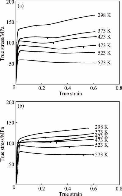 Fig. 1 True stress-strain curves of ECAP-treated Al comp- ressed to engineering strain of 45% at different temperatures and two strain rates of 1×10-3 s-1 (a) and 1×10-2 s-1 (b)