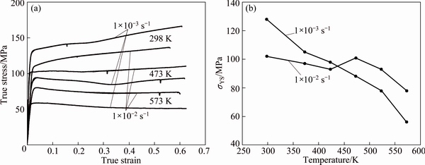 1) As the strain rate is 1×10-3 s-1, ECAP-treated Al undergoes a strain softening stage followed by a finally slight strain hardening after an initially rapid strain hardening at deformation temperatures of 373 K and 473 K, whereas at 1×10-2 s-1, strain softening phenomenon disappears. As T is above 473 K, continuous strain softening is exhibited at two strain rates. With raising T, the σYS monotonically decreases at 1×10-3 s-1, whereas the σYS slowly decreases, and then increases at 473 K followed finally by a rapid decline at 1×10-2 s-1. The increase in strain rate largely raises the σYS and flow stress at 473-573 K.