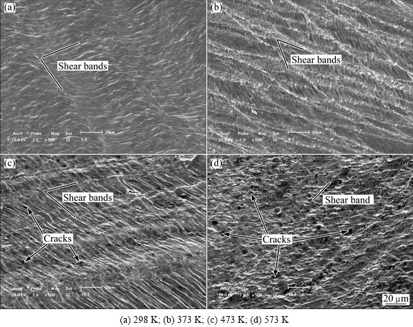 2) The compressive plastic deformation of ECAP-treated Al is mainly governed by shear deformation. The secondary SBs can be clearly observed with increasing T at 1×10-3 s-1; however, as T≥473 K, the secondary SBs in amount decrease, even disappear, meanwhile, more cracks are formed. Whereas at 1×10-2 s-1, the secondary SBs become more obvious with increasing T, and micro-cracks are only observable at T below 473 K.