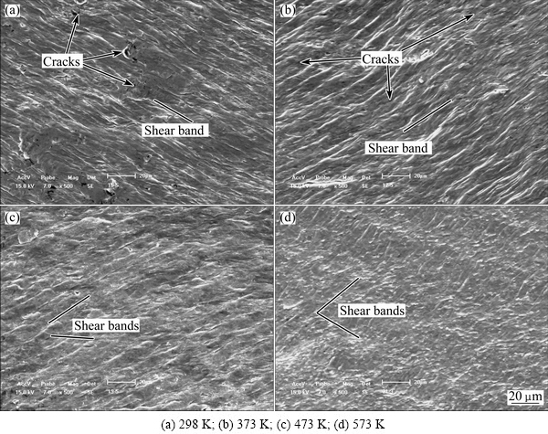 For all compressed samples, surface deformation characteristics are basically similar, namely, the large-scale shear bands (SBs) almost appear over the whole surface deformation regions. But there still exist some distinct differences at various deformation temperatures and the same strain rate. For example, with increasing T, the secondary SBs become more prominent at 1×10-3 s-1 (Figs. 3(a) and (b)). As T is 473 K, the amount of secondary SBs decreases and some cracks along SBs are formed (Fig. 3(c)). As T is raised up to as high as 573 K, the secondary SBs basically disappear and a number of cracks are observed (Fig. 3(d)). The similar results were also found in the UFG Cu, in which large-scale SBs cannot be formed at high temperature cyclic stressing [20]. However, in the case at 1×10-2 s-1, the secondary SBs become more obvious with increasing T (Fig. 4), and only a small amount of micro-cracks are detected at 298 and 373 K, respectively (Figs. 4(a) and (b)).