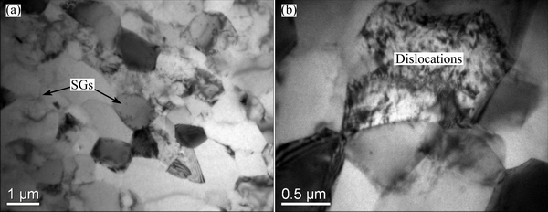Figure 5 displays the TEM images of the initial microstructures of as-ECAP-treated pure Al. The microstructure is primarily composed of sub-grains (SGs) with an average size of about 1 μm (Fig. 5(a)), and the dislocation density in some SGs is higher (Fig. 5(b)).