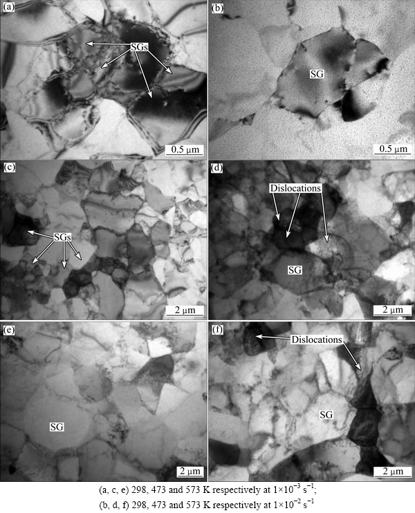 The microstructures of ECAP-treated Al compressed at different deformation temperatures and strain rates are still composed of SGs, but their size and the density of dislocations in SGs vary with T and strain rate. For example, the average size of SGs at 1×10-3 s-1 is smaller than that at 1×10-2 s-1 and 298 K (Figs. 6(a) and (b)), which is attributed to the continuous occurrence of dynamic recovery at 1×10-3 s-1 induced by the combined effects of external loading and relatively high atom mobility at a low strain rate. As T is 473 K, the growth of SGs is observed, and their size distribution becomes non-uniform, especially at 1×10-3 s-1, whereas the dislocation density in SGs is higher at 1×10-2 s-1 (Figs. 6(c) and (d)). As T is as high as 573 K, the growth of SGs becomes more remarkable, especially at 1×10-3 s-1, and the dislocation density in SGs is still higher at 1×10-2 s-1 (Figs. 6(e) and (f)).
