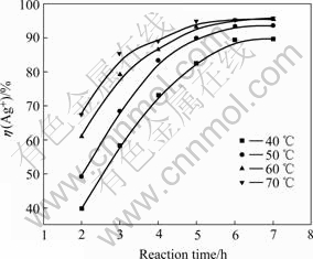Fig.1 Effect of reaction temperature and reaction time on Ag+ exchange fraction (η(Ag+))