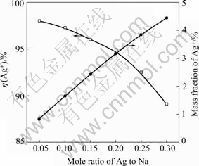 Fig.2 Effect of mole ratio of Ag to Na on Ag+ exchange fraction and mass fraction of Ag+ in AgxNa2-xLa2Ti3O10