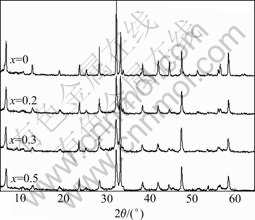 The XRD patterns of Na2La2Ti3O10 and AgxNa1-xLa2Ti3O10 (x= 0.2, 0.3 and 0.5) are shown in Fig.3. Obviously, the diffraction peaks of AgxNa2-xLa2Ti3O10 (x=0.2, 0.3 and 0.5) are almost the same as that of Na2La2Ti3O10, which are consistent with the earlier determined pattern of compound Na2La2Ti3O10 with tetragonal crystalline[17]. However, small changes are observed in the unit cell parameters of AgxNa1-xLa2Ti3O10 (x= 0.2, 0.3 and 0.5) because of the different sizes between Na+ (0.098 nm) and Ag+ (0.113 nm), as can be seen in Table 2. As a result, no significant changes in crystal structure of Na2La2Ti3O10 are found by the exchange of silver ions.