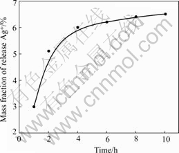 Fig.5 Relation between mass fraction of release silver ions for Ag0.3Na1.7La2Ti3O10 in deionized water and soaking time