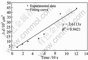 The coarsening rate constant k can be well adopted from the experimental data in Fig.8, where k=3.6113×103 μm3/s. It is apparent that the k value at 500 r/min is smaller than that at 10 r/min and 99 r/min for the same thermal condition[13]. In other words, the growth of primary Mg particles is suppressed by the increasing of shear rate during isothermal shearing. This slow coarsening rate can be attributed to a unique solidification behavior at high shear rate. As the particles are close to spherical and the particle size distribution is narrow, the driving force for coarsening is substantially reduced.