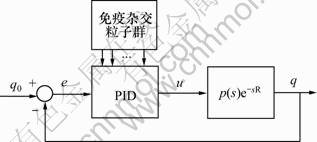 主动队列管理(Active queue management, AQM)是一种基于路由器的拥塞控制机制,是一种端到端的拥塞控制手段,既可减小排队时延,又可保证较高的吞吐量,从而达到抑制拥塞的目的[1]。近年来,主动队列管理技术业已成为网络研究领域中的焦点,相关研究人员进行了一些研究与探索,提出多种AQM算法,如RED[2],ARED[3]和SRED[4]等。与此同时,人们也研究出一些基于网络流量的控制模型[5],其中最具有影响力的是Misra等[6]于2000年提出的一种基于流体流理论的网络模型,该模型较准确地描述了TCP传输的行为。此外,人们将控制理论方法应用于网络拥塞控制,在现实工业领域中应用率最广的PID控制逐渐被应用到网络主动队列管理控制中,产生了PID[7]等主动队列管理算法,加强队列长度的控制能力,具有让人满意的暂态响应和较小的稳态误差,然而,PID控制器参数的整定比较困难。PID控制器的参数整定与优化已成为控制界研究的焦点。粒子群算法(Particle swarm optimization, PSO)是由Kennedy等于1995年提出的一种基于群体智能的全局优化进化算法[8],它源于对鸟类捕食行为的模拟。目前该算法已经成功地应用于函数参数优化、神经网络训练、模糊系统控制优化等领域[9]。由于粒子群自身不具备变异能力,随着进化的进行,粒子群算法容易陷入局部极值点。人工免疫系统是基于高等脊椎生物免疫系统机理发展而来的,它是人工智能研究的一个新领 域[10-11],具有多样性好、变异能力强、克隆复制与记忆力强等功能,使算法最终能逃逸出局部最优解,获得全局最优理想解。在此,本文作者基于以上分析,在流体理论的网络简化模型基础上,将PID控制器应用于计算机网络AQM中,应用免疫杂交粒子群算法,对控制器参数进行组合优化;在给定的搜索空间找到使性能指标优化函数极小化的一组PID控制器参数,构造一种基于免疫杂交粒子群算子的网络拥塞PID控制。