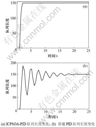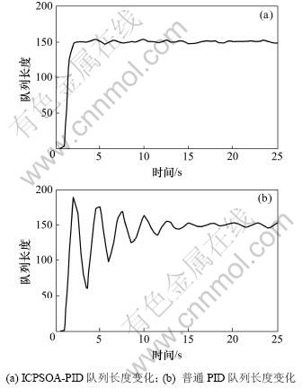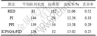 表1中:RED[2]为早期随机检测方法,PI为比例积分方法,PPI[16]为预测PI控制方法。从表1可以看出:文中ICPSOA-PID在队列长度、标准差、吞吐率及其丢弃率均比其他3种方法的优。