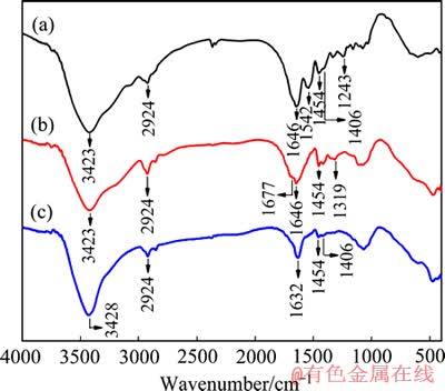 图1所示为明胶、聚丙烯酰胺和PGAM的红外光谱。由图1可见,明胶、聚丙烯酰胺、PGAM三者的吸收峰有一定差别。明胶的红外图谱具有以下特征峰:3423 cm-1(N—H伸缩振动峰),1646 cm-1(酰胺—Ⅰ、C=O和C—N伸缩振动峰),1542 cm-1、1243 cm-1(N—H弯曲振动和C—N伸缩振动峰),1406 cm-1 (COO-对称振动峰)。聚丙烯酰胺具有以下特征峰:3423 cm-1(N—H伸缩振动峰),1677 cm-1(酰胺—Ⅱ,C=O伸缩振动峰),1646 cm-1(酰胺—Ⅰ),2925 cm-1(C—H伸缩振动峰),1454 cm-1(CH2剪切振动峰)和1319 cm-1(CH2扭曲振动峰)。