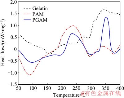 图2 明胶、聚丙烯酰胺和PGAM的DSC热分析图谱