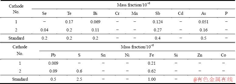 由表6可见,1号和2号阴极铜都达到了国家高纯阴极铜标准,其中1号阴极铜中As、Sb、Bi含量远低于2号阴极铜中的,这说明使用PGAM代替硫脲可以减少阴极铜中As、Sb和Bi含量。此外,2号阴极铜中含有6×10-6的S,而1号阴极铜中的S含量则低于检测极限,这说明使用PGAM代替硫脲可以避免添加剂中的S污染阴极铜。