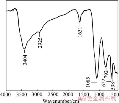图6所示为1号阳极泥的红外图谱,其主要吸收峰为N—H伸缩振动峰(3404 cm-1),C—H伸缩振动峰(2925 cm-1),C=O伸缩振动峰(1631 cm-1),As—OH吸收峰(1085 cm-1),As—OX(X=As, Sb)吸收峰(792 cm-1),Sb—OH吸收峰(1085 cm-1和598 cm-1),C—H摇摆振动峰或NH2变形振动峰(622 cm-1)。以上特征峰说明阳极泥中存在添加剂和含有As、Sb的化合物,进一步证实PGAM对漂浮阳极泥具有很好的絮凝作用。