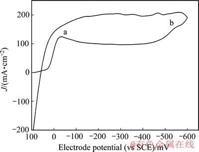 扫描速度为10 mv/s,从开路电位到-0.6 V范围内测量电解底液的循环伏安曲线,其结果如图7所示。由图7可知,电解底液循环伏安曲线阴极分支上分别在-30 mV和-550 mV附近出现还原峰a和b,分别对应Cu2+的还原和析氢反应,ab段为Cu2+的稳定析出阶段;在电位回扫过程中无氧化峰出现,这说明Cu2+的还原过程和析氢反应都是不可逆的。