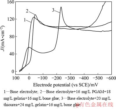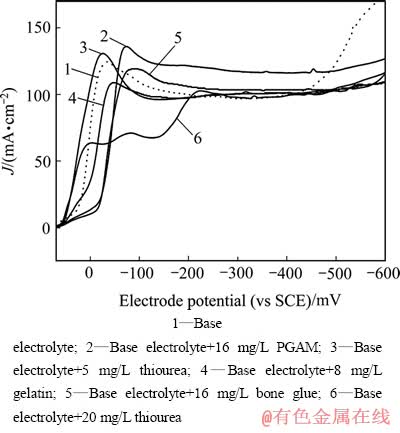 采用五水硫酸铜(AR)和浓硫酸(AR)配置电解底液,其成分为45 g/L Cu2+和185 g/L H2SO4;将明胶、骨胶、硫脲、PGAM配制成高浓度溶液,加到电解底液中。采用电化学工作站CHI600A(上海辰华仪器公司)对上述溶液进行电化学测试。实验采用三电极体系,研究电极为铜电极(d 1.48 mm),辅助电极为大面积的铂电极,参比电极为饱和甘汞电极,采用带有Luggin毛细管的盐桥以消除不同溶液间的液体接界电位。工作电极采用金相砂纸抛光磨平,用酒精、丙酮清洗,再用自来水、蒸馏水洗涤,所有测试均在65 ℃下进行。