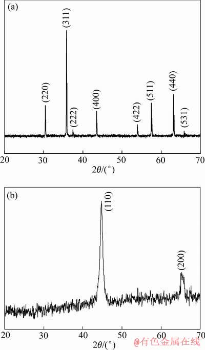 图4所示为NiLa0.02Fe1.98O4和CIP的XRD谱,将图4(a)与NiFe2O4特征XRD峰进行对比,可以看出,样品谱的XRD衍射峰与NiFe2O4的粉末衍射卡片数据库(JCPDS 71-1269)的特征XRD峰吻合很好,没有其他杂质峰出现,而且所有晶面的XRD峰峰形尖锐,相对强度强,说明此时形成晶体的晶型趋于完整,生成纯净的NiLa0.02Fe1.98O4粉末。图4(b)是CIP的XRD谱,与α-Fe的标准图谱(JCPDS 06-0696)一致,存在明显的晶相结构,无氧化物的衍射峰出现,说明CIP未被氧化。