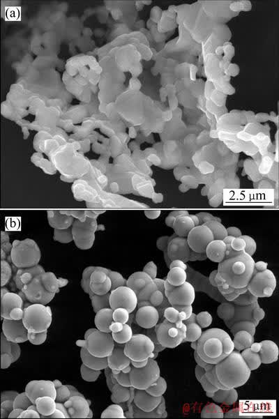图5所示为NiLa0.02Fe1.98O4和CIP粉末的SEM像。由图5(a)可以看出,NiLa0.02Fe1.98O4粉末颗粒棱角鲜明,呈多面体形状,颗粒尺寸较大,约为2 μm,少量粉末尺寸超过3 μm。由图5(b)中可见,CIP颗粒呈现出大小不一的圆球状,并团聚在一起,直径为1~4 μm。