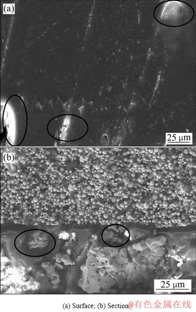 图6所示为本研究制备的双层吸波涂层的表面和截面SEM像。由图6(a)可见,涂层表面平坦,填料分布均匀。由于手工刷涂存在工艺控制误差,导致表面有少许缺陷(圆圈处)。图6(b)所示为涂层截面图,两层之间的界面十分明显。上层的CIP密集的聚集在一起,CIP的颗粒密实均匀地分布于涂层中,CIP颗粒被基体所包裹,使得各个CIP颗粒隔开,这也使得CIP颗粒之间没有形成导电网络,有利于电磁波的进入。下层NiLa0.02Fe1.98O4明显地被基体分隔开,NiLa0.02Fe1.98O4在涂层中的分布并不如CIP那样均匀,部分团聚在一起形成较大的颗粒分布于基体之中,出现了较大面积的基体剖面区和吸波剂区。图6(b)中出现的孔洞(圆圈处)是由于在切开涂层时其中的填料掉出所导致。