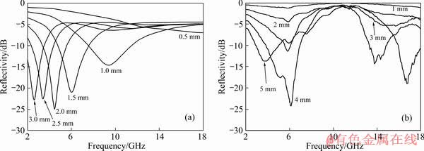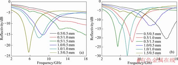 为了在尽可能地减小吸波涂层厚度的同时,增大吸收频宽且能更大限度的吸收电磁波能量,计算了面层与底层不同厚度和不同次序条件下的反射率。图 9(a)所示为NiLa0.02Fe1.98O4为面层,CIP为底层时不同厚度条件下的反射率;图9(b)所示为CIP为面层,NiLa0.02Fe1.98O4为底层时不同厚度条件下的反射率。