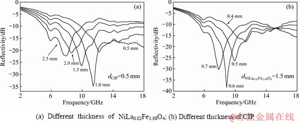 图8 CIP和NiLa0.02Fe1.98O4在不同厚度下的反射率曲线
