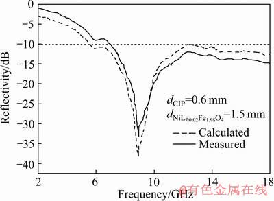 对所制备的双层吸波涂层进行了吸波性能测试,测试结果如图11所示。实测值和理论值虽然有一定的误差,但实测值还是基本反映出了理论优化的结果。