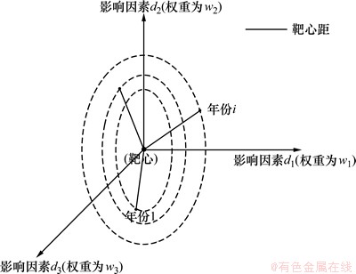 靶心即为历年能源需求量影响因素测度中所反映的理想状态下的极限(最小或最大)能源需求量灰色效果测度向量。年份i的能源需求影响因素灰色效果测度向量