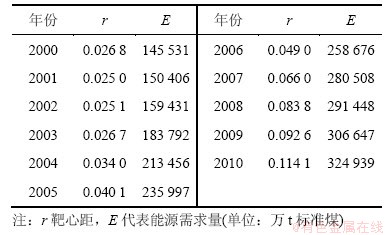 2000—2010年能源需求影响因素灰色效果测度向量靶心距序列r为