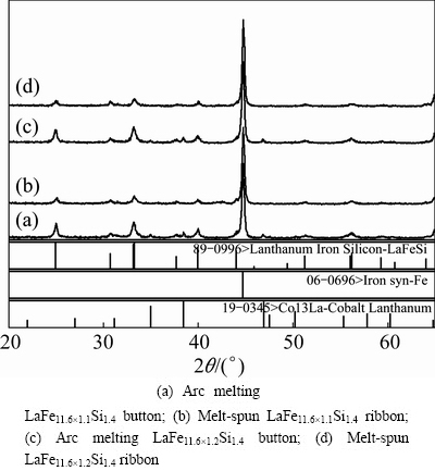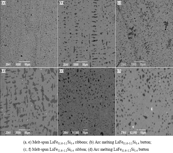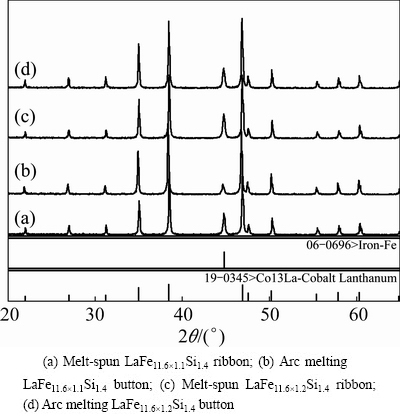 Approximately 15 g polycrystalline LaFe11.6xSi1.4 buttons were prepared by using high-purity starting elements (99.4% La, 99.9% Fe, and 99.9999% Si, mass fraction). The components were arc-melted on a water- cooled copper hearth under high-purity argon atmosphere. The buttons were turned over and re-melted five times to achieve a homogeneous composition. Each button was cut into two parts on average. An half of each button was re-melted and then spun into ribbons by a single-roller melt-spinner with a copper wheel at a speed of 10 m/s under a purified argon atmosphere. As the temperature of 1523 K was close to up limit temperature of peritectic reaction, button and ribbon samples were annealed at 1523 K for 5 h in a molybdenum wire furnace with a vacuum of 3×10-3 Pa, followed by furnace cooling down to room temperature. The crystallographic structures were determined by powder X-ray diffraction (XRD) analysis using Cu Kα radiation at room temperature. The microstructure and phase composition observations were carried out by scanning electron microscopy (SEM) and energy disperse spectroscopy (EDS) (Hitachi-S-3400N). Magnetic measurements were performed in vibrating- sample magnetometer (VSM, Lakeshore 7410) under a magnetic field up to 2 T.