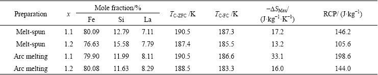 Since MCE is caused by 1:13 phase in LaFe13-xSix alloys, the element ratios in 1:13 phase should have a great influence on magnetic performance. Table 1 gives mole fractions of elements in 1:13 phases of two kinds of annealed LaFe11.6xSi1.4 samples obtained by EDS analysis. It is clear that the mole fraction of Fe in those samples does not increase with the increase of x, indicating that excessive Fe does not enter into 1:13 phase but exists as α-Fe phase. All element contents are very stable in two arc melting buttons. On the contrary, the contents are not stable in melt-spun LaFe11.6×1.1Si1.4 ribbons. This shows the existence of chemical component segregation in melt-spun samples. In total, La content in melt-spun LaFe11.6×1.1Si1.4 ribbons is smaller than that in arc melting LaFe11.6xSi1.4 alloys, and Si content is just contrary. To the best of our knowledge, there are few reports about the effect of element content in 1:13 phase on magnetic properties probably due to the perceived difficulties associated with coupling of crystallographic and magnetic structures.