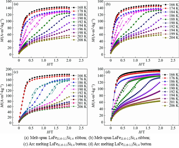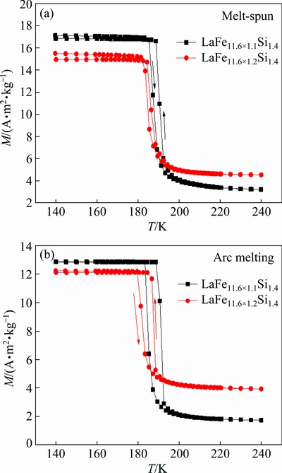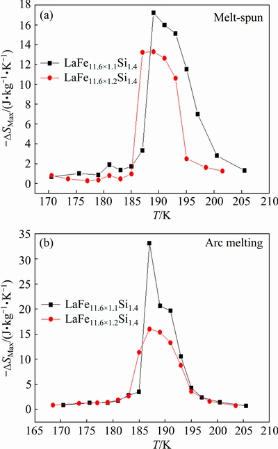 In Fig. 5, M-H curves have bending phenomena in the low field range when temperatures are higher than TC of 1:13 phase. It is from the contribution of soft magnetic α-Fe phase, which is in ferromagnetic state in the measurement temperature range due to its high TC of ~1023 K. By linearly extrapolating between the first large susceptibility stage and the small susceptibility stage, the M of intersection is the magnetization of α-Fe phase at the measured temperature. For different samples, with the increase of α-Fe phase content, the magnetization contribution from α-Fe phase also increases. However, α-Fe soft magnetic phase has high TC, and its magnetization contribution remains almost unchanged in the measured temperature range for the same sample. We can obtain the magnetizations of 1:13 phase at different temperatures in a 2 T applied field via eliminating the magnetization contribution of α-Fe phase. For example, the magnetizations of arc melting LaFe11.6×1.1Si1.4 and LaFe11.6×1.2Si1.4 alloys are 180 and 156 A·m2/kg at 166 K, the magnetization contributions of α-Fe phases are 31 and 44 A·m2/kg, respectively. Thus, the magnetizations of 1:13 phases under 2 T are 149 and 112 A·m2/kg at 166 K for arc melting alloys with x=1.1 and 1.2, respectively. Similarly, the magnetization of 1:13 phase in melt-spun LaFe11.6×1.1Si1.4 and LaFe11.6×1.2Si1.4 ribbons can be obtained, and the values are only 107 A·m2/kg at 168 K and 96 A·m2/kg at 164 K, respectively. The magnetization of 1:13 phase in melt-spun LaFe11.6xSi1.4 ribbons is lower than that in the corresponding arc melting buttons. According to Clausius-Clapeyron △SMax=-(△M·△HC)/△T [15], the negative isothermal magnetic entropy change (-△SMax) is proportional to the magnetization change of 1:13 phase. This predicts that -△SMax of annealed arc melting LaFe11.6xSi1.4 buttons should be higher than that of the corresponding melt-spun ribbons.