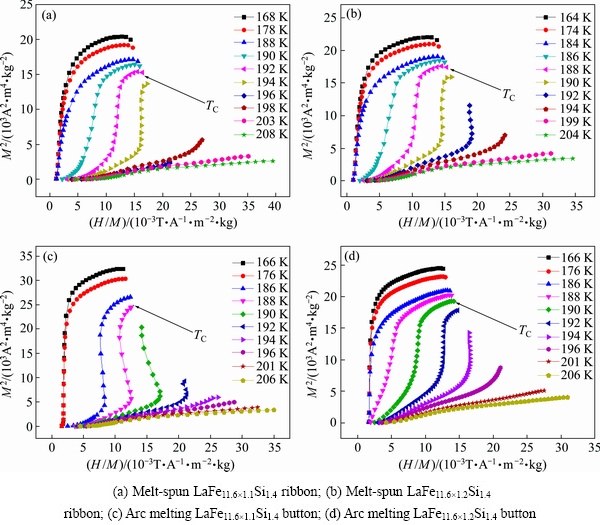 Figure 5 shows magnetization-magnetic field (M-H) curves of two kinds of annealed LaFe11.6xSi1.4 samples in a field change of 0-2 T. Before measurement, the samples were heated to paramagnetic state and cooled to the measuring temperature in zero field in order to ensure a demagnetized sample. Magnetic hysteresis and field-induced metamagnetic transition from PM to FM above TC of 1:13 phase are clearly observed, which are manifestations of the first order magnetic transition (FOMT). As shown in Fig. 6, the Arrott plots at and above TC show “S” shape, further confirming that the metamagnetic PM-FM transitions in those samples are of FOMT [13]. In addition, the curvature of Arrott plot can reflect the intensity of FOMT characteristic [14]. For arc melting LaFe11.6×1.1Si1.4 alloy, the Arrott plot’s curvature at TC is higher than that of other three alloys. Therefore, this alloy has the strongest first order characteristic.