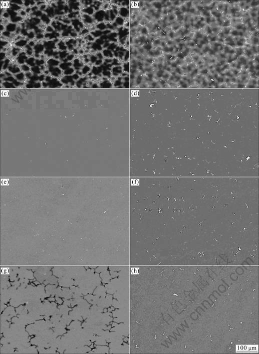 Fig.1 SEM images of alloys A and B in different heat treatment conditions: (a) Alloy A, as-cast; (b) Alloy B, as-cast; (c) Alloy A, solid solution treated; (d) Alloy B, solid solution treated; (e) Alloy A, aged at 200 ?C; (f) Alloy B, aged at 200 ?C; (g) Alloy A, aged at 100 ?C; (h) Alloy B, aged at 100 ?C