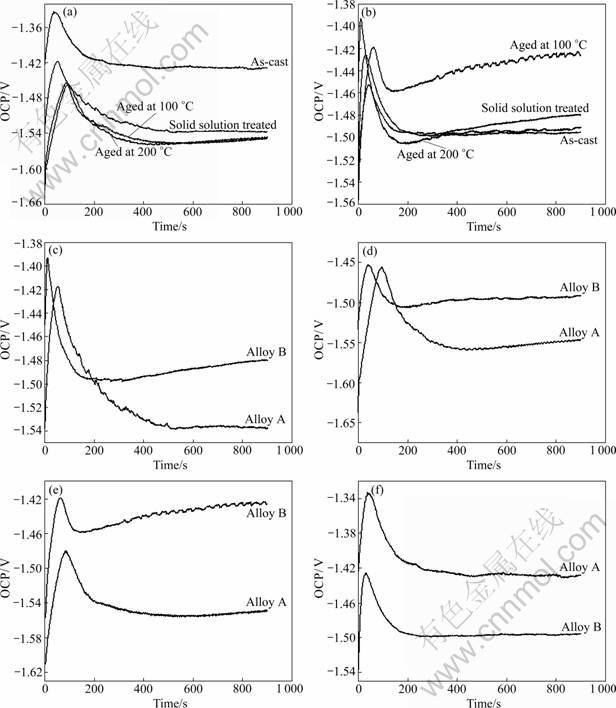 Fig.2 Evolution of open circuit potentials (OCP) of alloys A and B in 3.5% NaCl solution at 25 ?C: (a) Alloy A; (b) Alloy B; (c) Solid solution treated alloys; (d) Alloys aged at 200 ?C; (e) Alloys aged at 100 ?C; (f) As-cast alloys