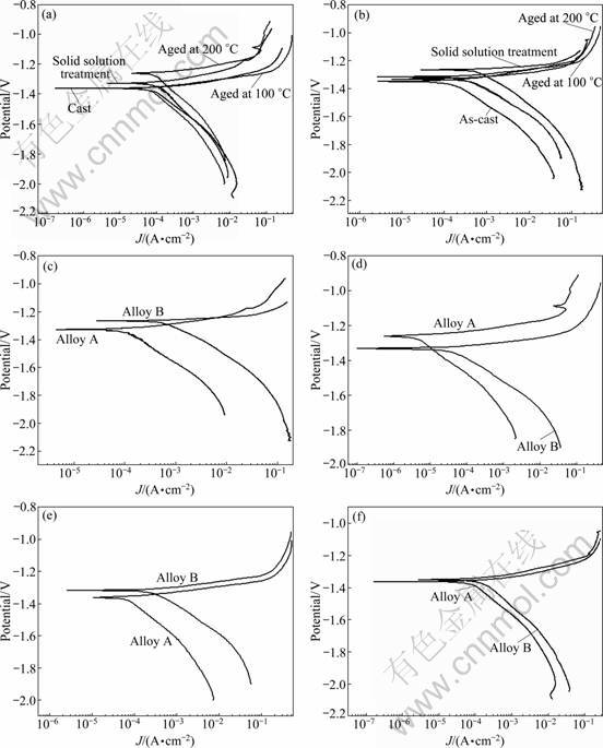 Fig.3 Potentiodynamic polarization curves of alloys A and B measured in 3.5% NaCl solution at 25 ?C: (a) Alloy A; (b) Alloy B; (c) Solid solution treated alloys; (d) Alloys aged at 200 ?C; (e) Alloys aged at 100 ?C; (f) As-cast alloys