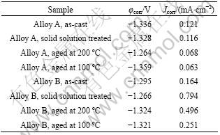 Table 2 Corrosion potentials (φcorr) and corrosion current densities (Jcorr) of alloys A and B under different heat treatment conditions
