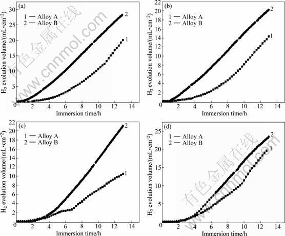 Fig.4 Hydrogen evolution volume as function of immersion time of alloys A and B immersed in 3.5% NaCl solution for 13 h: (a) Solid solution treated alloys; (b) Alloys aged at 200 ?C; (c) Alloys aged at 100 ?C; (d) As-cast alloys