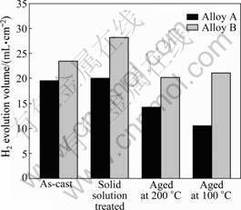 (mL/cm2), as a function of immersion time (h), of alloys A and B under different heat treatment conditions immersed in 3.5% NaCl aqueous solution for 13 h. It can be seen that there is initially an incubation period during which the rate of hydrogen evolution is quite low. The incubation periods of alloy B under each heat treatment condition are shorter than those of alloy A in the same condition, which is consistent with the incubation periods of the OCP mentioned above. Thereafter, the volume of hydrogen evolution increases with increasing immersion time, which can be attributed to the corrosion occurring on increasing corroded surface area of the specimen[12]. For long time immersion, the rate of hydrogen evolution becomes linear and the process of corrosion has achieved steady state. The incubation period of the hydrogen evolution is much longer than that of the OCP, indicating that the electrochemical technique is more sensitive in detecting the onset of corrosion than the technique based on the hydrogen evolution[9]. Fig.5 shows the volume of hydrogen evolution of alloys A and B under each heat treatment condition after being immersed in 3.5% NaCl solution for 13 h. It can be seen that the volume of hydrogen evolution of solid solution treated alloy B is the largest while that of alloy A aged at 100 ?C is the smallest. This is consistent with the average penetration rate Pj-Mg (mm/a) obtained from the corrosion current density. The volume of hydrogen evolution can be ranked in a decreasing series: alloy B, solid solution treated > alloy B, as-cast > alloy B, aged at 100 ?C ≈ alloy B, aged at 200 ?C ≈ alloy A, solid solution treated ≈ alloy A, as-cast > alloy A, aged at 200 ?C > alloy A, aged at 100 ?C. This rank is similar to that of the average penetration rate obtained from the corrosion current density except for as-cast alloy B, and alloy B aged at 200 ?C. So, it can be concluded that the volume of hydrogen evolution of